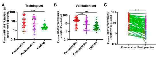 Plasma tRF-27 levels in patients with preoperative and postoperative gastric cancer and healthy individuals. Data are presented as medians (interquartile ranges from 25% to 75%). (A) Training set. Patients with preoperative gastric cancer (n = 48); patients with postoperative gastric cancer (n = 48); and healthy individuals (n = 48). (B) Validation set. Patients with preoperative gastric cancer (n = 58); patients with postoperative gastric cancer (n = 58); and healthy individuals (n = 72). (C) Plasma tRF-27 levels in postoperative patients (n = 71) were decreased. The colors indicate different groups. ** p < 0.01; *** p < 0.001.