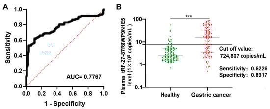 Diagnostic value of tRF-27 in gastric cancer. (A) ROC curve of tRF-27 in gastric cancer. (B) Cutoff value of tRF-27 in gastric cancer patients was 724,807 copies/mL. Healthy individuals (n = 120); Gastric cancer (n = 106). *** p < 0.001.