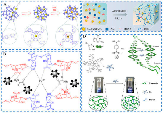 Physical embedding is the most common and convenient strategy to fabricate NMFHs. For example, Xu and Chen et al. constructed an antimicrobial hydrogel dressing via loading Ag nanoparticles (NPs) into a poly(vinyl alcohol) (PVA)/sodium alginate (SA)/carboxymethyl chitosan (CMCS) (PVA/SA/CMCS)-based network [42]. As reducing agents, hydroxyl and carboxyl groups on sodium alginate (Alg) chelated Ag+ which was reduced to Ag0 to form the Ag NPs-embedded matrix (Figure 2A). NMs can also form non-covalent interactions with gel network chains, such as electrostatic interaction and hydrogen bonds. Xia et al. designed a nanocomposite hydrogel based on Alg and edaravone-loaded Eudragit NPs (EDA NPs). Eudragit NPs were positively charged polymeric NMs, which could bind to negatively charged Alg chains through electrostatic interactions to form the hydrogel [43]. Keleher et al. prepared an antimicrobial hydrogel dressing by introducing Ag-coated TiO2 NPs (Ag/TiO2 NPs) into an SA-based matrix [44]. Due to the existence of many hydroxyl groups on the NPs core (TiO2), hydrogen bonds formed between the NPs and alginate chains. This non-covalent interaction results in a higher packing density (Figure 2B).