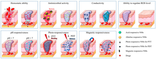 Every biochemical reaction needs to be carried out at an optimal pH. The pH value at the wound site changes dynamically during the healing process, which means the state of wound healing can be monitored and regulated by manipulating the local pH [173]. The optimization of wound healing speed by artificially introducing NMs capable of regulating pH has been studied [174].
