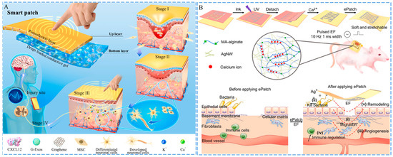 Carbon nanotubes (CNTs) are suitable carbon-based conductive materials because they have a larger specific surface area and higher conductive efficiency than conventional conductive materials [112]. For instance, a composite conductive hydrogel for wound healing was constructed by introducing conductive complexes and carboxylate multiwalled carbon nanotubes (MWCNTs) in the gel matrix. In addition, the hydrogel also had the ability to monitor the movement of the wound, such as the change in charge of conductive material caused by the change of stress in joints or elbows [113]. Guo and his team have developed a series of conductive hydrogels based on carbon-based materials for various wounds treatment, including DA-gelatin/CS/PDA@CNTs composite hydrogel utilized for treatment of infected wound [37], N-carboxyethyl CS/benzaldehyde-terminated PF127/CNTs composite hydrogel used for treatment of infected full-thickness skin wound [114], and quaternized CS-graft-cyclodextrin/quaternized CS-graft-adamantane/GO-graft-cyclodextrin composite hydrogel applied for treatment of skin defects [115]. Additionally, nerve damage frequently occurs in conjunction with cutaneous wounds. Electrical signals have been found to effectively stimulate nerve repair by inducing mesenchymal stem cells to differentiate into neural cells [116,117]. Peng et al. constructed a self-powered smart patch via coating of GelMA@rGO hydrogel onto polyvinylidene fluoride (PVDF) film [118]. The PVDF film acted as a flexible piezoelectric generator for electrical stimulation, while the hydrogel served as the reservoir of chemokine and neural directing exosomes as well as the electrode to transfer electric cues. The patch could promote nerve regeneration and sensation restoration at the wound site within 23 days, exhibiting great potential in nerve-damaged wound treatment (Figure 6A).