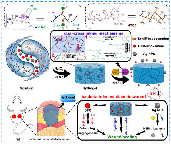Most bacteria produce acetic and lactic acids during multiplication and metabolism in infected wounds, resulting in local acidification (pH 4.5–6.5) [175]. Srivastava et al. loaded a polyelectrolyte-vitamin C nanoparticulate system into a PVA-Alg hydrogel to create an acidic environment around the wound to promote faster closure [176]. Dai and Li et al. loaded Ag NPs in a lignocellulose/SA/PVA network to construct a hydrogel. The acidic environment led to the disruption between Ag and boric acid, generating a longer pH-dependent release behavior of the hydrogel [177]. Wang et al., constructed a dual-cross-linked hydrogel from chitosan, quaternary ammonium salt, and ODEX-DA through the formation of catechol-catechol adducts and the Schiff base reaction [178]. They also opted for Ag NPs as the antimicrobial agent against infectious bacteria in the diabetic wound microenvironment. The acidic environment disrupted the network structure, leading to the responsive release of Ag NPs (Figure 9). Copello et al. developed a keratin hydrogel loaded with ZnO NPs for protection against bacterial infections. The hydrogel shrank under acidic conditions and swelled in response to contact with alkaline media in chronic wounds, thereby releasing NPs that formed an antimicrobial barrier and protected the wound from bacterial infection [179].