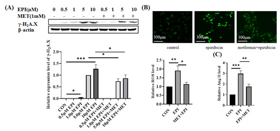Metformin alleviates epirubicininduced HUVEC cell dysfunction. (A) Expression levels of γ−H2A.X. HUVEC cells were respectively incubated with 0.5 μM, 1 μM, 5 μM or 10 μM EPI for 12 h with or without the pretreatment of 1 mM metformin for 12 h. The 5 µM epirubicin treatment group was used as the reference. (B) Levels of ROS. HUVEC cells were treated with 5 μM epirubicin for 6 h with or without the pretreatment of 1 mM metformin for 12 h. ROS levels were then detected by 5 mM DCFH−DA probe. (C) Levels of Ang II in the supernatant. HUVEC cells were treated with 5 μM epirubicin for 24 h with or without the pretreatment of 1 mM metformin for 12 h. Then, the levels of Ang II in the supernatant were detected by ELISA. EPI—epirubicin, MET—metformin, ns—not significant, * p < 0.05, ** p < 0.01, *** p < 0.001.