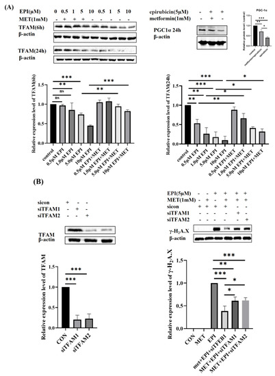Metformin restores mitochondrial biogenesis. (A) Expression levels of TFAM and PGC1α. HUVEC cells were treated with incubated with 0.5 μM, 1 μM, 5 μM or 10 μM EPI, respectively, for 6 h or 24 h with or without the pretreatment of metformin (1 mM) for 12 h. TFAM expression was detected by Western blotting. HUVEC cells were treated with 5 μM epirubicin for 24 h with or without the pretreatment of 1 mM metformin for 12 h, then PGC1α expression was detected by Western blotting. (B) Expression levels of γ−H2A.X. HUVEC cells were incubated with TFAM siRNA or control siRNA for 48 h. HUVEC cells were treated with 5 μM epirubicin for 24 h with or without the pretreatment of 1 mM metformin for 12 h. The levels of γ−H2A.X were detected by Western blotting. The epirubicin treatment group was used as the reference. EPI—epirubicin, MET—metformin, ns—not significant, * p < 0.05, ** p < 0.01, *** p < 0.001.