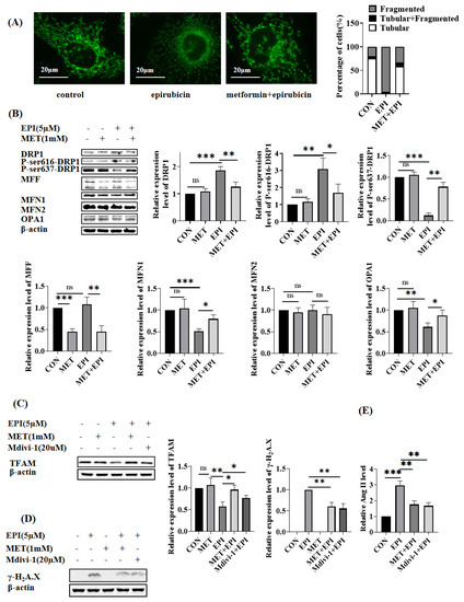 Metformin restores mitochondrial dynamics. (A) Mitochondrial morphology analysis by MitoTracker Green. HUVEC cells were treated with 5 μM epirubicin for 24 h with or without the pretreatment of 1 mM metformin for 12 h. Then, the cells were stained with 100 nM MitoTracker Green at 37 °C in the dark for 30 min and imaged. (B) HUVEC cells were treated with 5 μM epirubicin for 24 h with or without the pretreatment of 1 mM metformin for 12 h. The expression levels of mitochondrial dynamics related proteins were detected by Western blotting. (C). HUVEC cells were treated with 5 μM epirubicin for 12 h with the pretreatment of 1 mM metformin for 12 h or 20 μM mdivi−1 for 2 h, respectively. The expression levels of TFAM were detected by Western blotting. (D). HUVEC cells were treated with 5 μM epirubicin for 24 h with the pretreatment of 1 mM metformin for 12 h or 20 μM mdivi−1 for 2 h, respectively. The levels of γ−H2A.X were detected by Western blotting. The epirubicin treatment group was used as the reference. (E). HUVEC cells were treated with 5 μM epirubicin for 24 h with the pretreatment of 1 mM metformin for 12 h or 20 μM mdivi−1 for 2 h, respectively. The levels of Ang II in the supernatant were measured by ELISA. EPI—epirubicin, MET—metformin, ns—not significant, * p < 0.05, ** p < 0.01, *** p < 0.001.