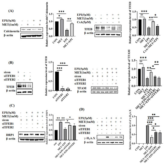 Metformin restores mitochondrial homeostasis via calcineurin/TFEB. (A) Metformin restores the calcineurin/TFEB pathway. HUVEC cells were treated with 5 μM epirubicin for 24 h with pretreatment of 1 mM metformin for 12 h or 5 μM CsA for 2 h, respectively. The expression levels of calcineurin and TFEB were detected by Western blotting. (B) Expression levels of TFAM. The expression of TFEB in HUVEC cells was inhibited by siRNA. Then, HUVEC cells were treated with 5 μM epirubicin for 12 h with or without the pretreatment of 1 mM metformin for 12 h. Western blotting was used to measure the TFAM expression. (C) Expression levels of DRP1. The expression of TFEB in HUVEC cells was inhibited by siRNA. Then, HUVEC cells were treated with 5 μM epirubicin for 24 h with or without the pretreatment of 1 mM metformin for 12 h. DRP1 expression was detected by Western blotting. (D) Expression levels of γ−H2A.X. The expression of TFEB in HUVEC cells was inhibited by siRNA. Then, HUVEC cells were treated with 5 μM epirubicin for 24 h with or without the pretreatment of 1 mM metformin for 12 h. Levels of γ−H2A.X were detected by Western blotting. The epirubicin treatment group was used as the reference. EPI—epirubicin, MET—metformin, ns—not significant, * p < 0.05, ** p < 0.01, *** p < 0.001.