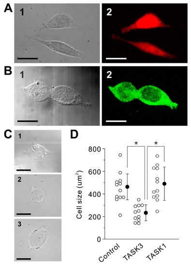 Morphological changes of TASK1- and TASK3- transfected mammalian cells in HEPES Ringer solution. (A) An infrared differential interference contrast (IR-DIC) image (1) and a DsRed2 fluorescent image (2) of TASK3-transfected CHO cells, captured immediately after being transferred from the cultured medium to HEPES Ringer solution. Scale bar, 20 μm. (B) An IR-DIC image (1) and a ZsGreen1 fluorescent image (2) of TASK1-transfected HEK293 cells, captured immediately after being transferred from the cultured medium to HEPES Ringer solution. Scale bar, 20 μm. (C) An IR-DIC image of a control mock-transfected HEK293 cell (1), captured immediately after being transferred from the cultured medium to HEPES Ringer solution and those of IR-DIC images of TASK3- (2) and TASK1-transfected HEK293 cells (3), captured 10 min after being transferred from the cultured medium to HEPES Ringer solution. Scale bar, 20 μm. (D) Cell sizes of nontransfected HEK293 cells which were taken just after being transferred from the cultured medium to HEPES Ringer solution and those of TASK3- and TASK1-transfected HEK293 cells which were taken 10 min after being transferred from the cultured medium to HEPES Ringer solution. Hollow and filled circles represent the individual and mean values of cell size, respectively. * p < 0.001, one-way ANOVA followed by Fisher’s PLSD.