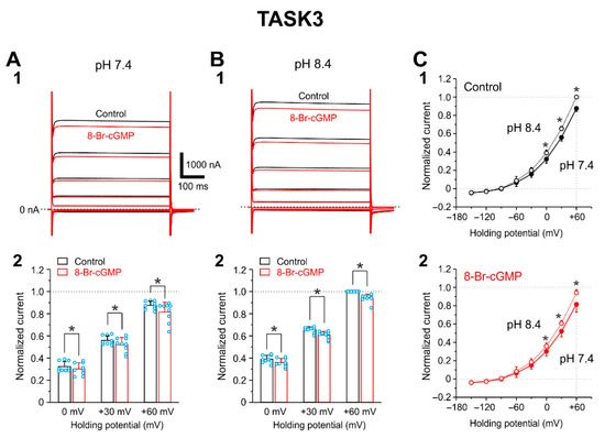 I-TASK3 was examined by applying voltage pulses at a holding potential of −90 mV from −150 to +60 mV by 30 mV steps. Following application of 100 μM 8-Br-cGMP, I-TASK3 evoked at pH 7.4 and pH 8.4 was slightly (~7%) decreased (Figure 2(A1,B1)). The pooled data analysis revealed that at pH 7.4, 8-Br-cGMP significantly (p = 0.018, two-way ANOVA: drug effect, F(1, 8) = 8.89) decreased I-TASK3 evoked at 0, +30, and +60 mV by 6.4%, 7.0%, and 7.0%, respectively (0 mV, p = 0.005; +30 mV, p < 0.001; +60 mV, p < 0.001, two-way ANOVA followed by Fisher’s PLSD; n = 9) (Figure 2(A2)). Similarly at pH 8.4, 8-Br-cGMP significantly (p = 0.001, two-way ANOVA: drug effect, F(1, 8) = 25.36) decreased I-TASK3 evoked at 0, +30, and +60 mV by 7.9%, 7.5%, and 5.9% (0 mV, p < 0.001; +30 mV, p < 0.001; +60 mV, p < 0.001, two-way ANOVA followed by Fisher’s PLSD; n = 9) (Figure 2(B2)). In consistent with the pH sensitivity reported previously [4,5], I-TASK3 was slightly but significantly larger at pH 8.4 than at pH 7.4 (Figure 2(C1); p < 0.001, two-way ANOVA: pH effect, F(1, 8) = 95.47). This pH sensitivity was not changed even after I-TASK3 was decreased by 8-Br-cGMP (Figure 2(C2); p < 0.001, two-way ANOVA: pH effect, F(1, 8) = 33.98).