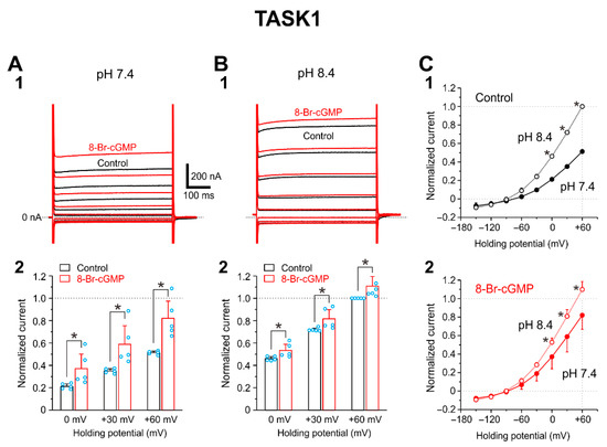 8-Br-cGMP enhances heterologously expressed TASK1 channels in oocytes. (A1,B1) Superimposed traces of I-TASK1 evoked by voltage steps ranging between −150 and +60 mV in 30 mV steps applied at a holding potential of −90 mV at pH 7.4 (A1) and pH 8.4 (B1) obtained before (black traces) and after applying 100 μM 8-Br-cGMP (red traces). (A2,B2) The normalized values of I-TASK1 recorded before and during the application of 8-Br-cGMP at pH 7.4 (A2) and those at pH 8.4 (B2). All the current amplitudes were normalized by the amplitude of I-TASK1 evoked at +60 mV in the extracellular solution at pH 8.4. * p < 0.05, two-way ANOVA followed by Fisher’s PLSD. (C1,C2) I-V relationship of I-TASK1 examined at pH 8.4 and pH 7.4 in the absence (C1) and presence of 8-Br-cGMP (C2). Following increases in pH in the extracellular solution from 7.4 to 8.4, I-TASK1 examined at 0 to +60 was significantly and similarly increased both in the absence and presence of 8-Br-cGMP. Hollow and filled circles represent the mean amplitudes of normalized currents obtained at pH 8.4 and 7.4, respectively. * p < 0.05, two-way ANOVA followed by Fisher’s PLSD.