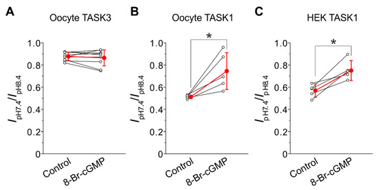 Differential effects of 8-Br-cGMP on TASK3 and TASK1 channels. (A,B) The ratio of the I-TASK3 amplitude at pH 7.4 to that at pH 8.4 recorded at the membrane potential of +60 mV in oocytes obtained before and following 8-Br-cGMP application in oocytes (A) and that of the I-TASK1 amplitude (B). Note that 8-Br-cGMP significantly increased the ratio of I-TASK1 (B), whereas it did not significantly affect the ratio of I-TASK3 (A), consequently largely decreasing the difference in the ratio between TASK1 and TASK3. * p < 0.05, paired t-test. (C) The ratio of the I-TASK amplitude at pH 7.4 to that at pH 8.4 recorded between −95 and −70 mV obtained before and following 8-Br-cGMP application in HEK293 cells. Note that 8-Br-cGMP significantly increased the ratio of I-TASK1 in HEK293 cells as well as in oocytes. Hollow and filled circles represent the individual and mean values of the normalized current amplitudes, respectively. Red line represents the change in the mean current amplitude following application of 8-Br-cGMP. * p < 0.05, paired t-test.