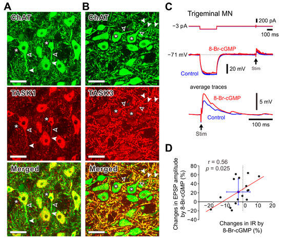 2.5. Subcellular Distributions of TASK1 and TASK3 Channels and Effects of 8-Br-cGMP on Excitatory Postsynaptic Potentials (EPSPs) in MNs in the Dorsolateral Trigeminal Motor Nucleus (dl-TMN)