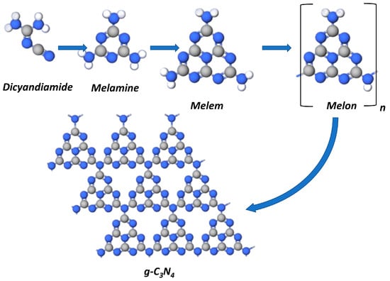 The formation of graphitic carbon nitride proceeds by various routes at thermal condensation of the abovementioned precursors. At thermal pyrolysis, the cyclization of any of the above mentioned nitrogen-containing precursors yields melamine [49]. The dimerization of melamine at 350 °C yields melem and melon that transforms into polymeric g-C3N4 at temperatures above 500 °C (Figure 2).