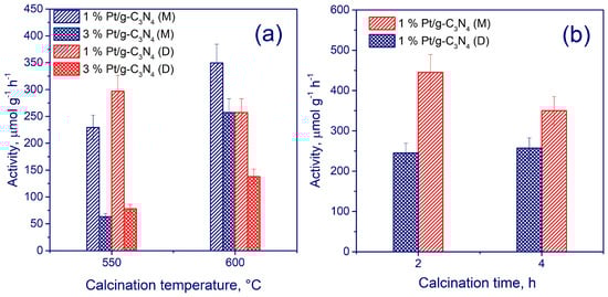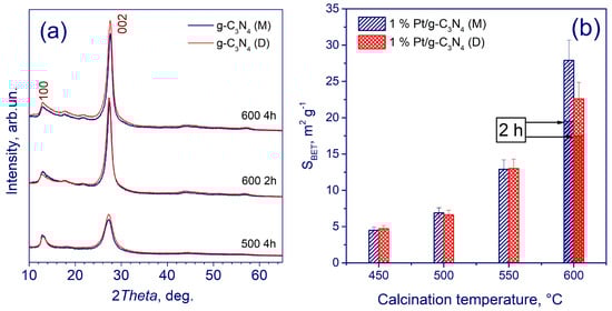 At the first step of the study, g-C3N4 was prepared by the traditional thermal condensation of organic precursors—melamine and dicyandiamide. The calcination was performed at varying temperatures (450, 500, 550 or 600 °C) and times (2 or 4 h) in air. In order to prevent charge recombination and increase the catalyst activity, 1–3 wt.% platinum was loaded by impregnating g-C3N4 with H2PtCl6, and then followed by reducing with a 2.5-fold excess of NaBH4. After several decantations, the obtained samples were dried at 50 °C for 4 h. The synthesized photocatalysts were characterized by XRD (Figure 3a) [76].