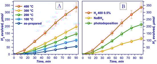 Kinetic curves of the photocatalytic evolution of hydrogen from an aqueous solution of triethanolamine (TEOA) over (A) catalysts reduced in H2 flow at different temperatures, and (B) using photocatalysts reduced by various methods. Adapted with permission from Ref. [102]. 2022, Elsevier.