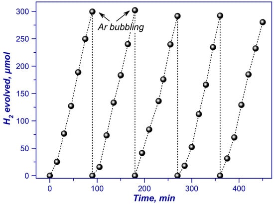 Stability of the 0.5% Pt/g-C3N4 (T = 400 °C) photocatalyst in five 1.5 h cycles of hydrogen production. Adapted with permission from Ref. [102]. 2022, Elsevier.