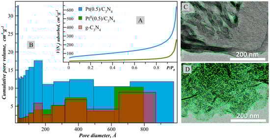 (A) Adsorption isotherms; (B) pore size distribution for g-C3N4, 0.5% Pt/g-C3N4 (IV) without treatment and 0.5% Pt/g-C3N4 (IV) after reduction in H2 at 400 °C. (C) TEM images of photocatalysts 0.5% Pt/g-C3N4 (no treatment) and (D) 0.5% Pt/g-C3N4 (Т = 400 °С). Reprinted with permission from Ref. [103]. 2022, Elsevier.
