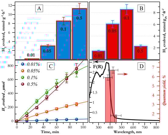 Additionally, an interesting dependence was observed for these samples. Catalytic activity per 1 g of Pt noticeably increased with increasing platinum content (0.01, 0.05, and 0.1 wt.% Pt). However, as the mass fraction of Pt increased further from 0.1% to 0.5%, the respective activity value decreased from 8.8 to 2.3 mmol gPt−1·h−1. At the same time, the rate of hydrogen production per 1 g of catalyst for the sample 0.5% Pt/g-C3N4 was about 20% higher than that value for catalyst 0.1% Pt/g-C3N4 (Figure 8a–c). Thus, 0.1 wt.% Pt loading is the optimum for efficient production of hydrogen. The apparent quantum efficiencies of hydrogen production were calculated for different wavelengths (action spectrum) (Figure 8d). The maximum quantum efficiency was 6.6% at a wavelength of 425 nm. The action spectrum of the photocatalyst agrees well with the Kubelka–Munk curve F(R) calculated from the diffuse reflectance spectrum of the 0.5% Pt/g-C3N4 (IV) photocatalyst.