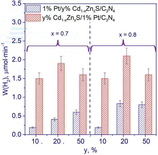 Photocatalytic activity of samples 1%Pt/y%Cd1−xZnxS/g-C3N4 and y%Cd1−xZnxS/1% Pt/g-C3N4. Adapted from [104].