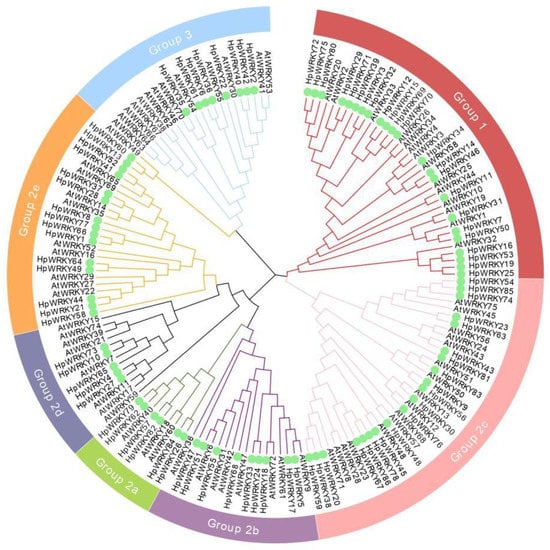As shown in Figure 1, a neighbor-joining phylogenetic analysis of 86 H. perforatum and 72 Arabidopsis WRKYs sequences using default parameters and 1000 bootstraps. According to the phylogenetic analysis, 86 HpWRKY proteins could be classified into three groups, of which 23 HpWRKY proteins belonged to Group 1, 55 HpWRKYs belonged to Group 2, and 8 HpWRKYs belonged to Group 3. Group 2 was further divided into five subgroups (2a–2e), containing 6, 9, 22, 5, and 13 proteins respectively. The classification of HpWRKYs confirmed the diversity of their protein structures, suggesting that different subfamily members may have different regulatory functions, and that orthologous genes are likely to have similar functions. For instance, AtWRKY72 utilizes an SA-independent defense mechanism and plays a role in the basic defense against various pathogens and pests []. Then, as a homologous gene of AtWRKY72, AtWRKY18 may have the same function. AtWRKY75 not only enhances drought and salt tolerances; it isconsidered to be a positive regulator in the JA or SA mediated defense signal response to the necrotrophic fungal pathogens, which can cause soft rot in a wide range of plant hosts []. In other words, HpWRKY54, HpWRKY85, and HpWRKY74 may have the same regulation mechanism.