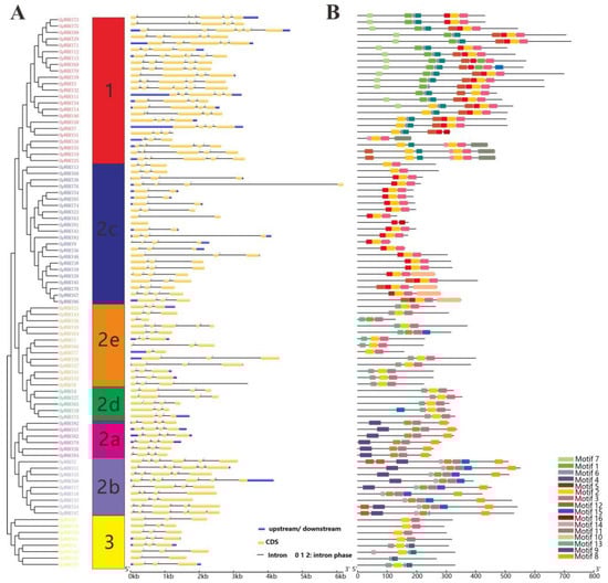 The phylogenetic relationships, gene structure, and composition of conserved motifs in WRKY from H. perforatum. (A) The phylogenetic on the left contains 86 WRKY proteins (named HpWRKY1 to HpWRKY86). The yellow boxes, gray lines, and blue boxes in the exon-intron structure diagram represent exons, introns, and UTRs, respectively. (B) The motif patterns of 86 HpWRKY proteins.