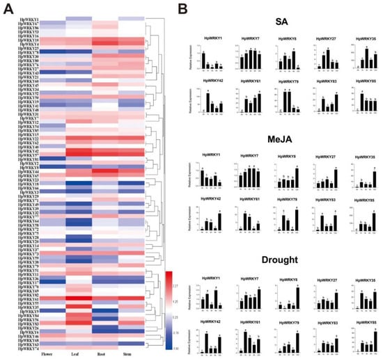 Expression profiles of HpWRKY genes. (A) Hierarchical clustering of expression profiles of HpWRKY genes in different tissues (root, stem, leaf, and flower; three biological replicates). log10(FPKM) values were displayed according to the color code (bottom left). (B) qRT-PCR assay-based expression patterns of 10 selected HpWRKY genes in 2-month-old H. perforatum leaves under SA, MeJA, and drought treatments. Data were normalized by HpACT2 (MK054303), calculated with the equation 2−ΔΔCt. All data represent averages of three biological replicates. Error bars indicate ±SD. Different letters indicate significant differences from the control (p < 0.05) tested by one-way ANOVA.