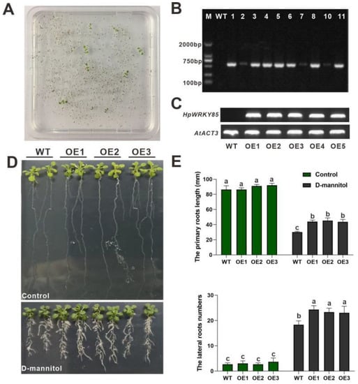 Function of HpWRKY85 when expressed in Arabidopsis plants. (A) Screening of Arabidopsis transgenic plants, positive plants can grow normally on the screening medium. (B) PCR results of HpWRKY85. HpWRKY85 cannot be cloned from WT lines, but can be cloned from OE transgenic lines. (C) Expression levels of HpWRKY85 in rosette leaves of WT and five OE lines analyzed by RT-PCR. (D,E) The phenotype, primary root length, and lateral root numbers of WT and OE seedlings under normal condition (control) and D-mannitol. Each value represents the average of three replicates, and the error bars represent ±SD. Different letters indicate significant differences from the control (p < 0.05) tested by one-way ANOVA.