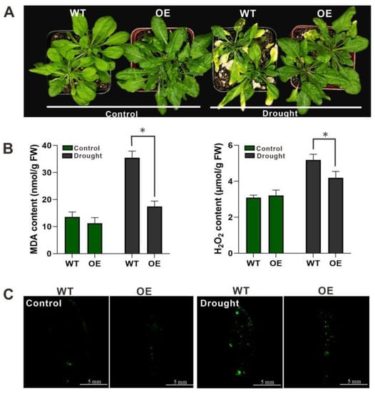 Drought tolerance test. (A) Four-week-old plants of WT and OE in soil were dehydrated for 8 days. (B) MDA and H2O2 accumulation in WT and OE lines under drought stress. Each value represents the average of three replicates, and the error bars represent ±SD. * indicate significant differences from the control (p < 0.05) tested by one-way ANOVA. (C) Histochemical staining with fluorescent CM-H2DCFDA to detect reactive oxygen species in WT and OE lines under drought stress.