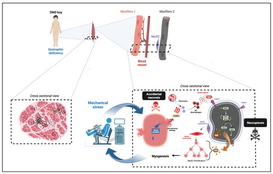 The first identification of a genetically programmed form of necrosis in the degeneration affecting skeletal muscle tissue was in dystrophinopathies [18] (Figure 2). In human DMD human biopsies, MLKL phosphorylation has been observed in myofibres, suggesting ongoing necroptotic demise in terminally differentiated muscle cells. Mouse and human dystrophin-deficient myofibres undergoing necrosis correlate with RIPK3 upregulation, which powerfully sensitizes muscle cells and cardiomyocytes to TNFα-elicited necroptosis [18,185]. RIPK3 depletion represses the necrotic spike affecting mdx mice at 3 weeks of age, indicating that the TNFα-mediated myonecrosis at the onset of mdx pathogenesis is due to necroptosis. This study does not report a significant role for RIPK3-dependent cell death in the mild degeneration occurring in adult mdx mice [18]. In dystrophin-deficient Golden retriever muscular dystrophy (GRMD) dogs, evidence of RIPK3-driven myonecrosis is also found in the diaphragm and the heart [186]. The long-term genetic ablation of RIPK3 in mdx mice dampens fibrosis deposition in respiratory and locomotor muscles. Another study showed that cardiotoxin muscle injury can be prevented by the inhibition of the kinase activity of RIPK1, or by the genetical depletion of MLKL [19]. Interestingly, myofibre necroptosis is associated with Tenascin-C release, which directly supports MuSCs proliferation and early myogenesis. Necroptotic demise could therefore be an important mechanism of myofibre death which paves the way for the early phases of muscle regeneration [19]. Long-term RIPK3 depletion does not show regenerative defects in mdx mice, suggesting that necroptosis is dispensable for long-term myogenesis and muscle remodelling in muscular dystrophy [186].