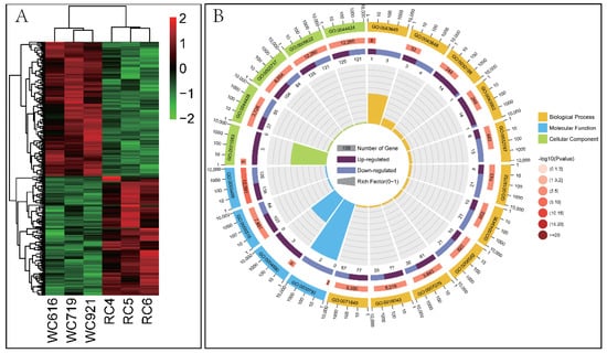 A total of 388 DEGs were obtained via transcriptome expression differential gene analysis (Log2 FC > 0.58 or < −0.585, false discovery rate (FDR) < 0.05). The enrichment heat map is shown in Figure 1A, within which the key genes are reportedly associated with meat quality traits including insulin-like growth factor 2 (IGF-2), acyl-CoA oxidase 1 (ACOX1), angiopoietin like 4 (ANGPTL4) and solute carrier family 27 member 5 (SLC27A5). A large number of novel candidate genes connected to bovine muscle development and lipid metabolism were also identified: agouti signaling protein (ASIP), CD44 molecule (CD44), syndecan-3 (SDC3), agrin (AGRN), fructose-bisphosphatase 1 (FBP1), glutamic-oxaloacetic transaminase1, (ACTC1), crystallin alpha B (CRYAB), and ankyrin repeat domain 2 (ANKRD2). Among the DEGs, 205 genes were up-regulated in the Longissimus dorsi of Wagyu compared with Chinese Red Steppe cattle, and 183 genes were down-regulated. The details of the top 10 up- and down-regulated DEGs are shown in Table 1 and Table 2, respectively. Notably, 22 genes were uncharacterized in the database, the details of which are in Table S3.
