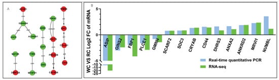 Prediction analysis of genes interaction network and validation of sequencing data. (A) Gene interaction network: red circles represent up-regulated genes, green circles represent down-regulated genes; (B) the fold change of DEG expression levels.