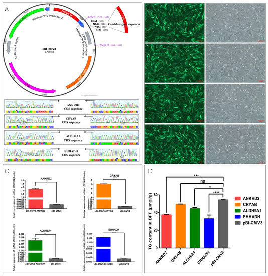 To analyze the functions of key candidate DEGs involved in lipid metabolism, overexpression vectors of related genes were constructed separately. The coding sequences (CDSs) of the ANKRD2, CRYAB, ALDH9A1 and EHHADH genes were successfully amplified by PCR and ligated to the pBI-CMV3 vector (Figure 3A). The BFFs in overexpression and negative control groups showed regular morphological expression of green fluorescent proteins (GFPs) 24 h post-transfection (Figure 3B). RT-qPCR was used to detect the candidate genes. The results showed that the mRNA expression levels of ANKRD2, CRYAB, ALDH9A1 and EHHADH in each overexpression group significantly increased (p < 0.01) compared with the control group (Figure 3C).