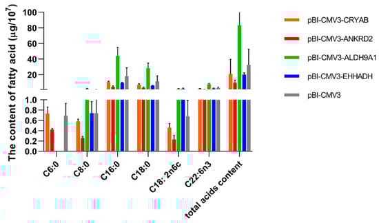Compared with the control group, each fatty acid (except for hexanoic acid) and total fatty acids decreased in the CRYAB and ANKRD2 overexpression groups; the content of each fatty acid and total fatty acids within the ALDH9A1 overexpression group (83.48 ± 20.22 μg) was higher than that for the control (34.29 ± 20.10 μg). In the EHHADH group, the amount of linoleic acid (1.79 ± 0.863 μg) and cis-4,7,10,13,16,19-docosahexaenoic acid (2.01 ± 0.686 μg) increased in BFFs, while the rest of the fatty acids decreased. In addition, hexanoic acid was not detected in the ALDH9A1 and EHHADH overexpression groups.