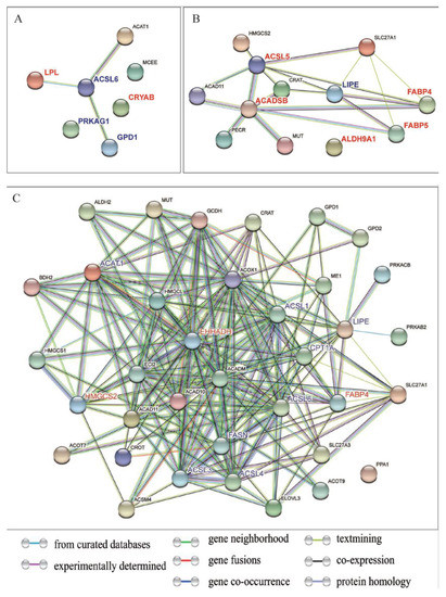 Prediction of protein interaction between genes related to fat and fatty acid metabolism and candidate genes. (A) CRYAB and fatty acid metabolic pathway protein interaction network; (B) ALDH9A1 and fatty acid metabolic pathway protein interaction network; (C) EHHADH and fatty acid metabolic pathway protein interaction network.
