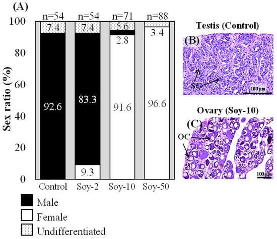 Feminization effects of soy isoflavones in Japanese eels. (A) Sex ratios in Japanese eels treated with 2, 10, or 50 g/kg diet of soy isoflavones (Soy). Control, normal diet with no soy isoflavone treatment. (B,C) Histological sections of gonads after hematoxylin and eosin staining: control eel testis (B) and isoflavone-treated eel ovary (C). SG, spermatogonium; OC, oocyte.