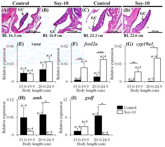 Japanese eels raised to at least 120 days with body length >30 cm were sacrificed, and their gonadal sex was determined. In the control group, 92.6% (n = 50) of the eels were males, and 7.4% (n = 4) were undifferentiated (Figure 1A). In the soy isoflavone-treated group fed the low dose of soy isoflavone (2 g/kg feed), 9.3% (n = 5) were females, whereas in the groups fed the medium and high doses of soy isoflavone (10 and 50 g/kg feed), 91.6% (n = 65) and 96.6% (n = 85) were females (Figure 1A). Spermatogonia were observed in males in the control groups (Figure 1B), and oocytes were observed in females in the soy isoflavone-treated groups (Figure 1C). To investigate gene expression, the eels were raised to 45 days and then divided into two groups according to body length (medium 15.0–19.9 cm; large 20.0–24.9 cm). In both length groups of the controls and soy isoflavone-treated eels, the germ cells were at the undifferentiated stage (Figure 2A–D). Next, the expression patterns of five sex-specific genes (vasa, foxl2a, cyp19a1, amh and gsdf) were analyzed by quantitative real-time PCR (qPCR). The germ cell marker vasa was expressed in the controls and in the soy isoflavone-treated groups (Figure 2E). Expression of the female-specific genes foxl2a and cyp19a1 were significantly higher in the gonads of the soy isoflavone-treated eels than in those of the controls in both length groups (Figure 2F,G). Conversely, in the large-length groups, expression of the male-specific genes amh and gsdf was significantly higher in the gonads of the control than in the gonads of the soy isoflavone-treated eels (Figure 2H,I).