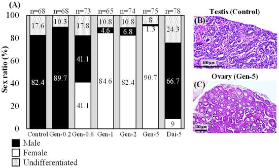 A diet with 0.2 g/kg feed dose of genistein resulted in 89.7% males, a diet with 0.6 g/kg feed dose of genistein resulted in 41.1% females (Figure 3A), and diets with 1, 2, and 5 g/kg feed dose of genistein resulted in >80% females (Figure 3A,C). In contrast, a diet with a 5 g/kg feed dose of daidzein resulted in 66.7% of males, and only 9.0% of the eels had ovaries (Figure 3A). The control group consisted of 82.4% males (Figure 3A,B).