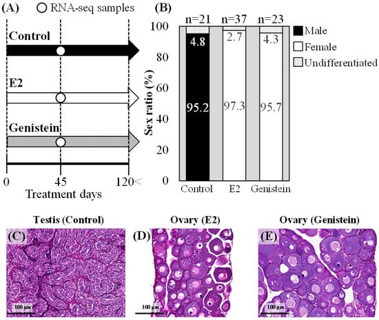 We performed RNA-seq analysis to determine the estrogenic effect of the phytoestrogen genistein on several sex-related genes in Japanese eels compared with the effect of E2. Eels raised to 45 days were collected for gonadal histology (Figure 4A), and all were found to have undifferentiated gonads. Among the eels reared to at least 120 days, 95.2% (n = 20) were males, and 4.8% (n = 1) had undifferentiated gonads in the controls (Figure 4B,C), whereas 97.3% (n = 36) were females, and 2.7% (n = 1) had undifferentiated gonads in the E2-treated eels (Figure 4B,D). Similarly, 95.7% (n = 22) were females, and 4.3% (n = 1) had undifferentiated gonads in the genistein-treated eels (Figure 4B,E).
