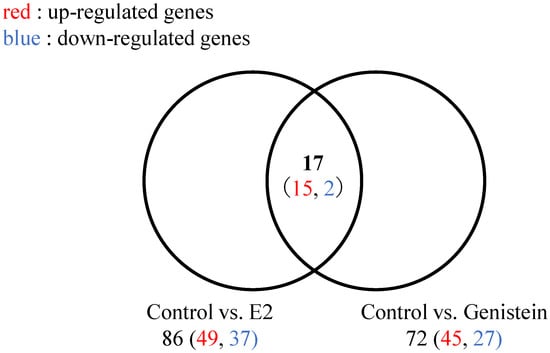 E2- and genistein-induced changes in gene expression. Venn diagram showing the number of differentially expressed genes with expression changes of >10-fold in E2- and genistein-treated eels compared with the genes of control eels.