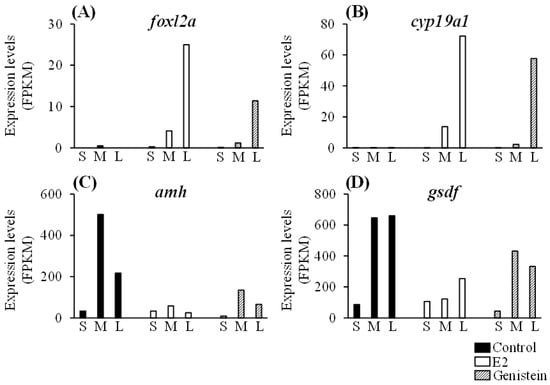 We focused on genes with fragments per kilobase of exon per million mapped reads (FPKM) values that changed by >10-fold in the E2- and genistein-treated eels compared with the FPKM values in the control group; 86 and 72 such genes were detected in the E2- and genistein-treated eels, respectively (Figure 5, Supplementary Table S1). Among these differentially expressed genes, 15 were up-regulated, and 2 were down-regulated in both the E2- and genistein-treated eels (Figure 5, Table 1). The female-specific genes foxl2a and cyp19a1 had FPKM values that were higher in the gonads of E2- and genistein-treated juveniles than they were in the control eels in the medium and large groups (Figure 6A,B). The male-specific genes amh and gsdf had FPKM values that were higher in the gonads of the control juveniles than they were in the E2- and genistein-treated eels in the medium and large groups (Figure 6C,D).