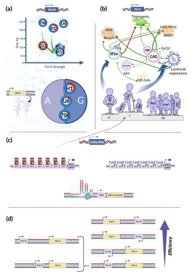 Finally, transfer RNA (tRNA) promoters stand apart of those described above (Figure 1a). The tRNAs represent a highly conserved class of small, non-coding RNA molecules that undergo specialized steps of cleavage and posttranscriptional modification [65]. For purposes of CRISPR-based systems, tRNA gene promoters have been used to replace U6 promoters for gRNA production via Pol III. For example, the expression of gRNA from 70-bp promoters from MHV68 tRNA and glutamine tRNA showed comparable levels of luciferase activity inhibition compared to the U6 promoter [66]. This approach can be used as an alternative to small versions of U6 or H1 promoters for compact expression systems.