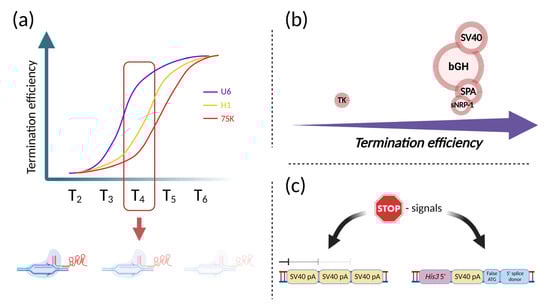 For Pol II-driven transcription, many terminators have been used. Most popular are SV40, bGH and TK polyadenylation signals [70]. They differ by two main parameters—efficiency of termination and length. In terms of efficiency, the SV40 late polyadenylation signal is similar to bGHpA, but it is almost half as long, which is important for the development of compact synthetic systems [71]. The rbGlob poly(A) signal is another highly efficient terminator derived from the rabbit beta-globin gene. Based on this poly(A) signal, a short synthetic terminator has been developed—SPA (synthetic poly[A] site), which is only 49 bp in length [72]. Another compact poly(A), even shorter than SPA, was obtained from the soluble neuropilin-1 (sNRP-1) gene poly(A) signal. Of only 32 bp in length, it showed a similar level of generated mRNA compared to the SV40 polyadenylation signal (Figure 2b) [73]. Of note, apart from efficiency in mRNA production, poly(A) signals can also affect vector stability when transiently transfected into cells [74].
