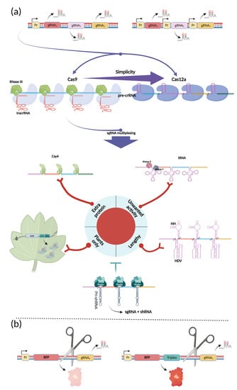 Multiplexing expression modules. (a) Different approaches of multiplexing have been developed for CRISPR-based applications. In general (top), the expression of multiple gRNAs can be provided by a single promoter or multiple promoters. In the first case, multiplexed gRNA arrays can be processed naturally by different mechanisms: for Cas9, pre-crRNA is processed by the Cas9/RNase III/tracrRNA complex, while for the Cas12a-based systems, processing of pre-crRNA is simpler and is mediated by the single effector. As for Cas9, a deployment of alternative multiplexing strategies is important when sgRNAs are used. These strategies include Csy4-mediated cleavage, tRNA-mediated RNaze P/Z processing, ribozyme-mediated cleavage, native sgRNA processing in plants, and shRNA-based strategy. Red neuron-like connections depict the limitation of each Cas9-multiplexing approach, when applicable; (b) A triple helix RNA (named triplex) protects RNA from degradation, stabilizing its 3′end, thus allowing further effective translation. Figure was created using BioRender.com.