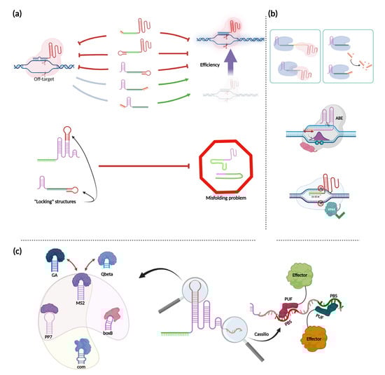 gRNA modifications. (a) Impact of sgRNA and crRNA modifications on OFF-target activity and editing efficiency. Adding hairpin structures or small flaps to the end of gRNAs results in different outcomes for Cas12a- and Cas9-based systems. Red inhibitory lines depict the antagonism between different modifications and the OFF-target effect or editing efficiency. Green arrows depict the opposite. Gray lines mark modifications that do not have any effect on specificity. The bottom scheme depicts the approach to block misfolding of impaired gRNA by introducing a “locking” structure inside their sequences; (b) Different functional consequences of gRNA sequence modifications. Upper left: a shared usage of single gRNA by Cas12a and Cas9. Upper right: an enhancement of trans-cleavage activity of Cas12a used in pair with elongated crRNA. Middle: restriction of the modification window for the Cas9 base-editor ABE for spacers truncated to 19 nts or elongated to a length of more than 24 nts. Bottom: a decrease in the length of sgRNA to 15 nts or fewer (but not less than 11 nts) completely eliminated the ability of Cas9 to cleave DNA while retaining the ability to bind recognition sites and to activate thereby adjacent genes; (c) Implementing sequence augmentations and aptamers. On the left side, different RNA aptamers are depicted. Dark red arrows indicate interchangeability between aptamer binding proteins. Transparent colored clouds depict examples of non-overlapping multiple usage of different aptamers inside shared synthetic systems. The right side depicts a part of the Cassilio system, with effectors fused with PUF-domains, specifically programmed to bind different PBS (PUF-binding site). Figure was created using BioRender.com.