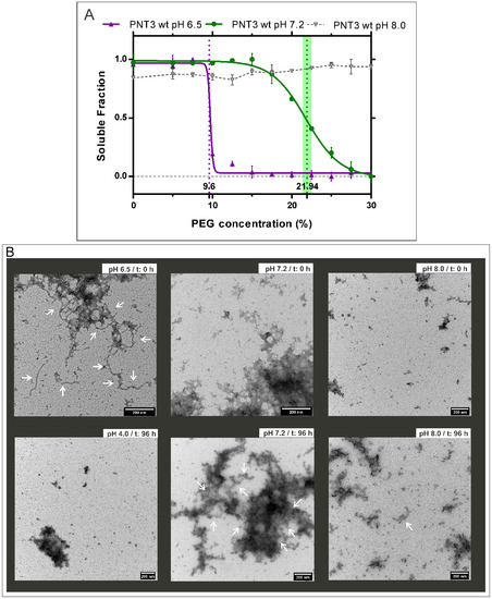 Fibrillation propensity of HeV PNT3 wild-type (wt) at different pHs. (A) PEG assay and relative solubility of HeV PNT3 wt at pH 7.2 (green), 6.5 (violet) and 8.0 (light gray). The vertical lines correspond to PEG1/2 values (with their 95% confidence intervals) as obtained after a normalization and fitting step to a sigmoid function. Note that the curve obtained at pH 6.5 exhibits poor fitting thus preventing calculation of the confidence interval. Data points at pH 8.0 could obviously not be fitted. (B) Ns-TEM of HeV PNT3 wt fibrils at four different pH values: 6.5 (at time 0, t: 0 h), 7.2, 8.0 (at time 0 and after 96 h of incubation at 37 °C, t: 96 h) and 4.0 (after 96 h of incubation at 37 °C, t: 96 h). White arrows indicate fibrils.