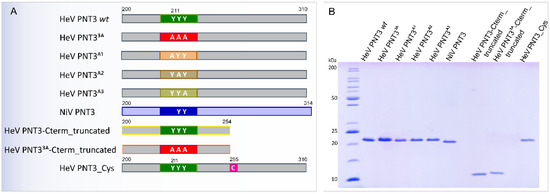 (A) Schematic diagram of HeV PNT3 variants designed and constructed in this work. The EYYY motif of the HeV PNT3 is shows in green. (B) SDS-PAGE analysis of the purified proteins.