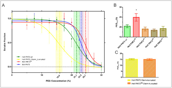 PEG solubility assays for the set of PNT3 variants. (A) Soluble fraction of each variant at different PEG concentrations. HeV PNT3 wt (green), HeV PNT33A (red), HeV PNT3_C-term_truncated (yellow), NiV PNT3 (blue). Vertical lines represent PEG1/2 values including their 95% confidence intervals obtained after a normalization and fitting step to a sigmoid function. (B) PEG1/2 values obtained for the wt, the triple alanine variant and the single alanine HeV PNT3 variants. (C) PEG1/2 values obtained for the C-terminally truncated variants. The asterisk indicates statistically significant differences (One-way Anova test, p-value < 0.05).