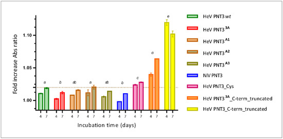 The construct encoding the HeV PNT3 variant bearing a cysteine (PNT3_Cys) was obtained using the pDEST17OI/PNT3 construct [25] as template in two separate PCR amplifications using either primers attB1 and specific PNT3_C255_R (PCR1), or primers PNT3_C255_F and attB2 (PCR2). After DpnI treatment, 1 µL of PCR1 and 1 µL of PCR2 were used as overlapping megaprimers along with primers attB1 and attB2 in a third PCR. After purification, the third PCR product was inserted into pDEST17 (Invitrogen, Carlsbad, CA, USA). The list and sequence of primers used to generate the above-described constructs is provided in Supplementary Table S2. Primers were purchased from Eurofins Genomics. All the constructs were verified by DNA sequencing (Eurofins Genomics Germany GmbH, Ebersberg, Germany) and found to conform to expectations.