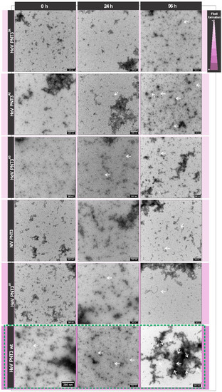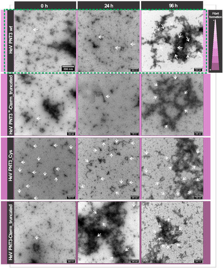 Fibril formation as a function of time by ns-TEM. Ns-TEM analysis of PNT3 variants (200 μM) at time zero and after 24 h or 96 h of incubation at 37 °C. Note that in all cases, samples were diluted to 40 μM prior to being deposited on the grid. White arrows indicate fibrils. The purple gradient represents the propensity to form fibrils. The green dashed box indicates HeV PNT3 wt results.