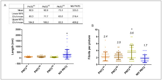 Fibril length of EYYY variants. (A) For each variant, statistics on fibril length were obtained from analysis of the contour length of 60 fibrils after 96 h of incubation at 37 °C. The upper table shows the main statistical results. (B) Number of fibrils detected per picture for each variant. Upper number indicates the mean value of each variant. The analysis was done using the ImageJ software. The asterisk indicates statistically significant differences (One-way Anova test, p-value < 0.05). Circles: PNT3A1; squares: PNT3A2; triangles: PNT3A3, inverted triangles: NiV PNT3.