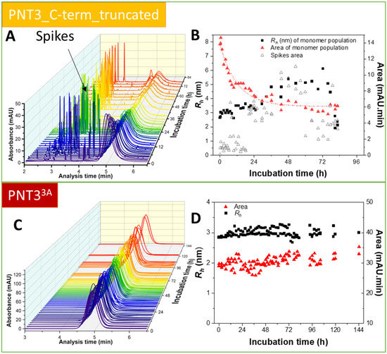 In light of the fibrillation properties of all the PNT3 variants herein investigated, as revealed by the ensemble of studies described above, we decided to focus on the two variants with the most extreme phenotype, namely the variant with the highest fibrillation propensity, i.e., HeV PNT3_C-term_truncated, and the least fibrillogenic variant, i.e., PNT33A. Figure 8A,C show a three-dimensional overview of the obtained taylorgrams during the aggregation process of the two selected variants. In the case of the truncated variant, two major species were detected over time: the monomer (hydrodynamic radius, Rh, of ~3 nm) (Figure 8B) and large aggregates with an Rh ≥ 400 nm (see spikes at the beginning of the run in Figure 8A). Figure 8B shows that the Rh value of the soluble fraction increases with time, reaching about double its initial value at the end of the incubation, when this species is present in low proportions. Figure 8B also shows that the monomeric population slowly decreases with time. The decrease of the peak area (Y) of the monomeric population could be fitted using a first order exponential decay: